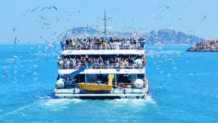 除了“硬核海景”,荣成也有柔和的一面。春日里,最适合来一次海驴岛环岛游。船行海上,成群的海鸥追逐盘旋,伸出手臂,便能与这些洁白的“海上精灵”来一次亲密互动。